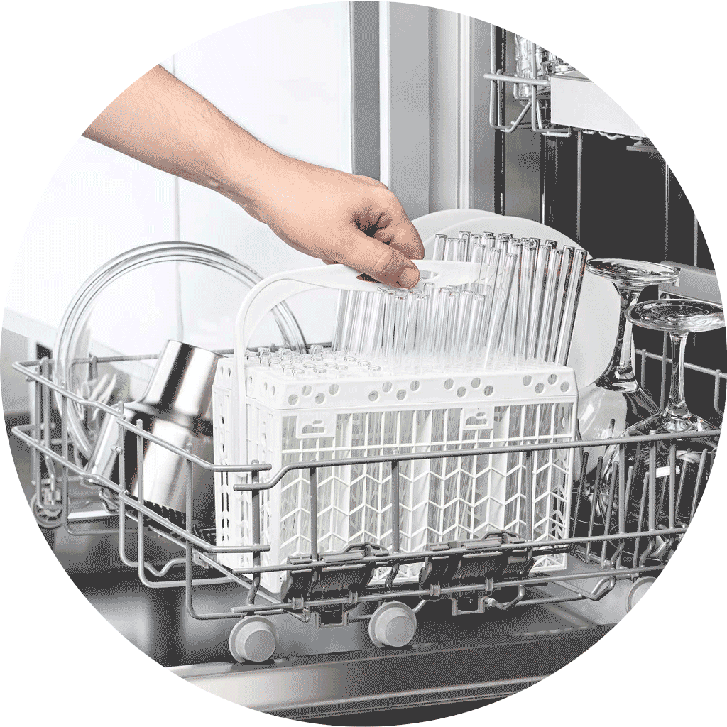 We also offer a silverware basket that fits up to 80 Glass Straws to make cleaning your reusable straws the most simple experience. Additionally, any commercial dishwasher will work or any cutlery basket is suitable for cleaning glass straws.