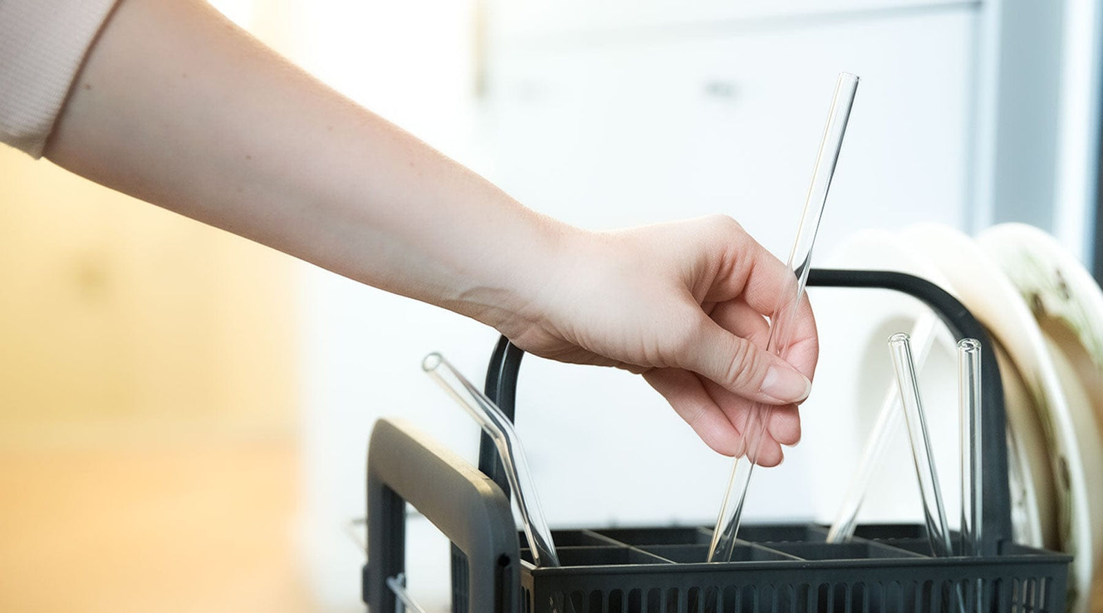 HALM straws are made of high quality glass, and therefore dishwasher safe. Simply place glass straws upright in the silverware basket in the dishwasher on a standard program with your daily wash and HALM drinking straws will be sparkling clean from top to bottom. Cleaning glass straws can be compared to cleaning any standard glassware like a drinking glass. If there is no cutlery basket, glass straws can also be placed individually on the rods or simply in the cutlery drawer laying down.