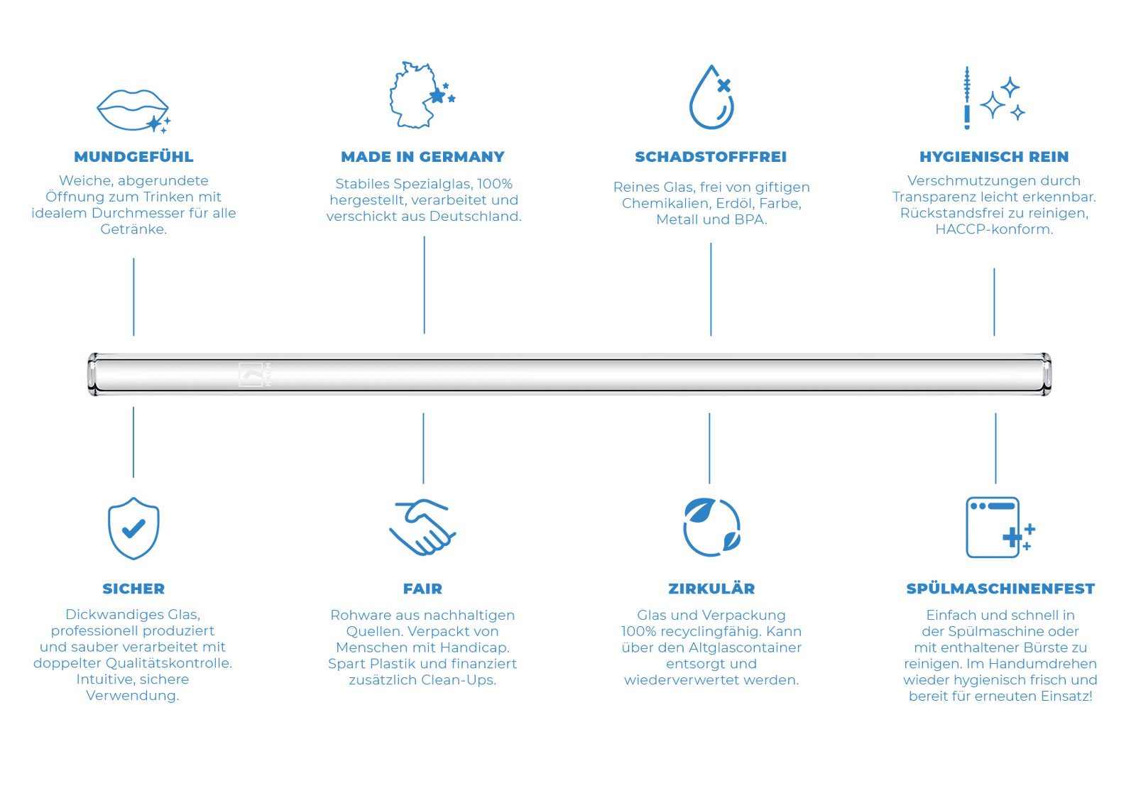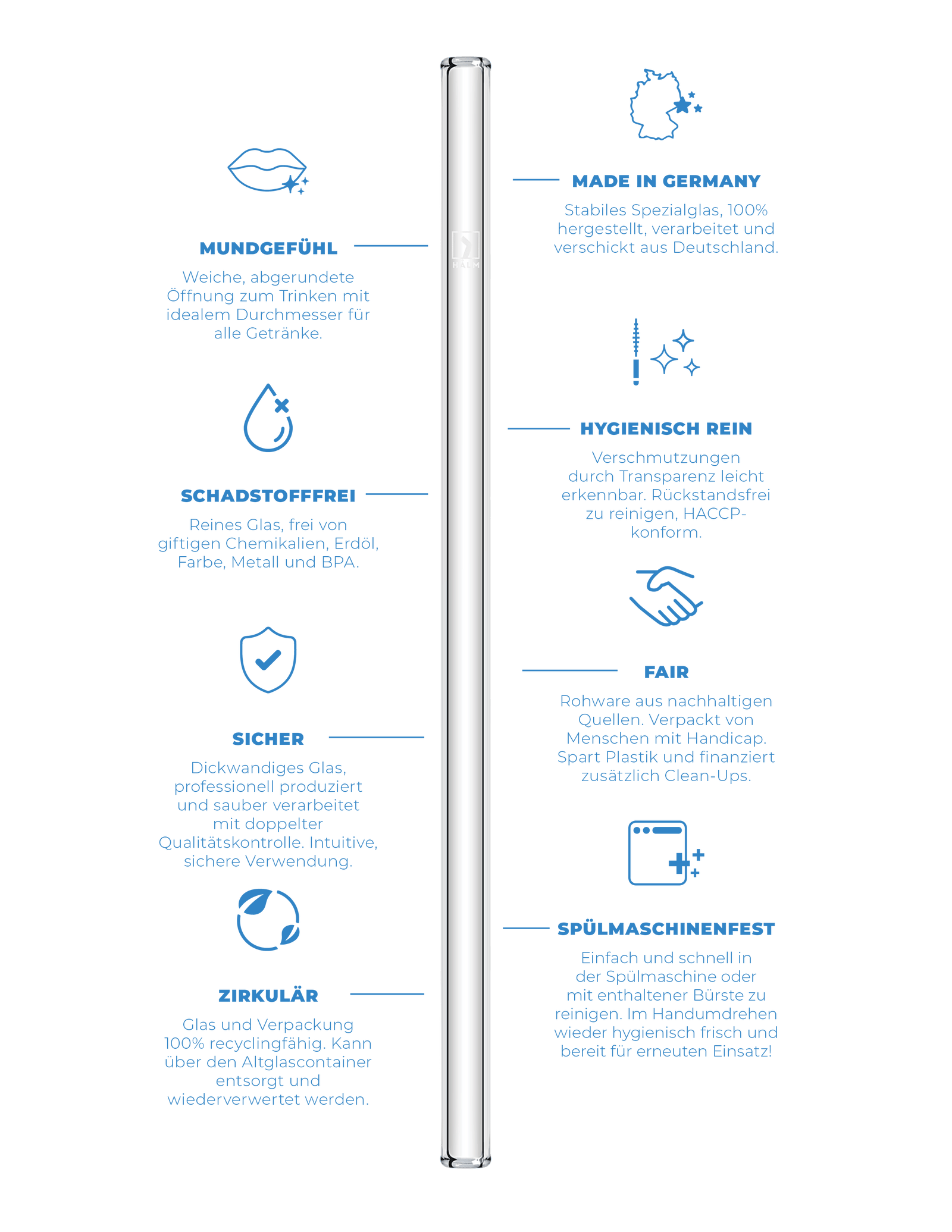 circularity is important to us. We believe in products that reusable and are recyclable at the end of their life. That is of course far from being the case with glass! Many manufacturers use borosilicate glass. If such a glass straw, it cannot simply be disposed of in the waste glass container, since the degree of melting of this glass is too high. HALM dispenses with borosilicate and petroleum-based paints . In the rare event of breakage, our glass can be completely and without Loss of quality recycled and be reused. This is how resource-saving works circular economy.